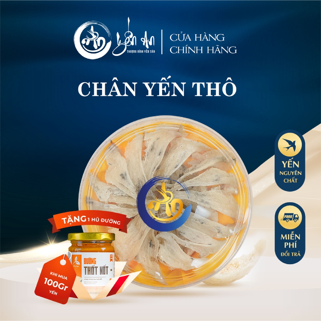 – Chân yến thô chưa qua sơ chế, còn nguyên tình trạng mới thu hoạch; là phần dày, đặc và già nhất trên tổ, được hình thành từ quá trình chim yến nhả nước bọt liên tục để tạo cấu trúc vững chắc cho tổ.