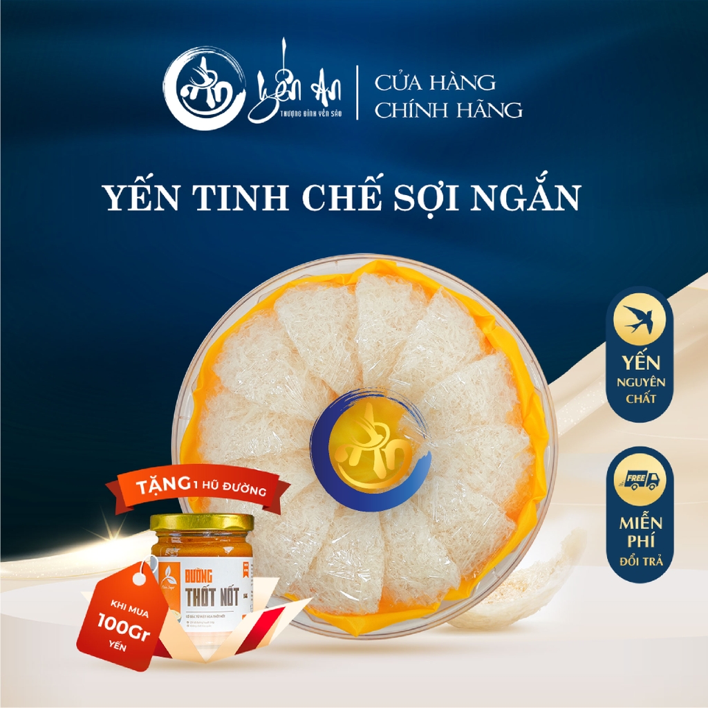 – Yến tinh chế sợi ngắn là loại yến được đắp từ những mảnh tổ yến bị vỡ trong quá trình thu hoạch. Sau khi được làm sạch, những sợi yến này sẽ được đắp thành tổ với tỷ lệ: 30% xơ mướp (phần bụng yến), 70% sợi ngắn.